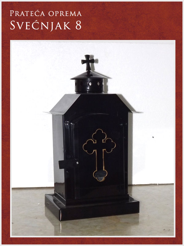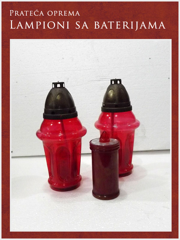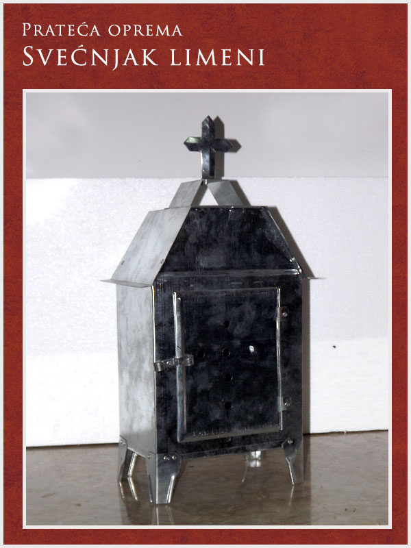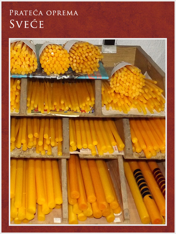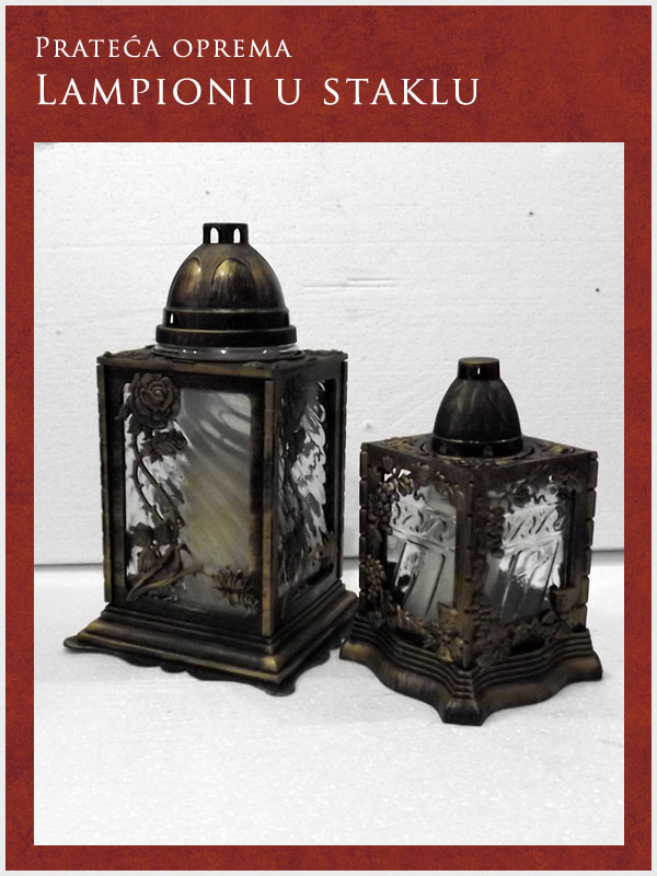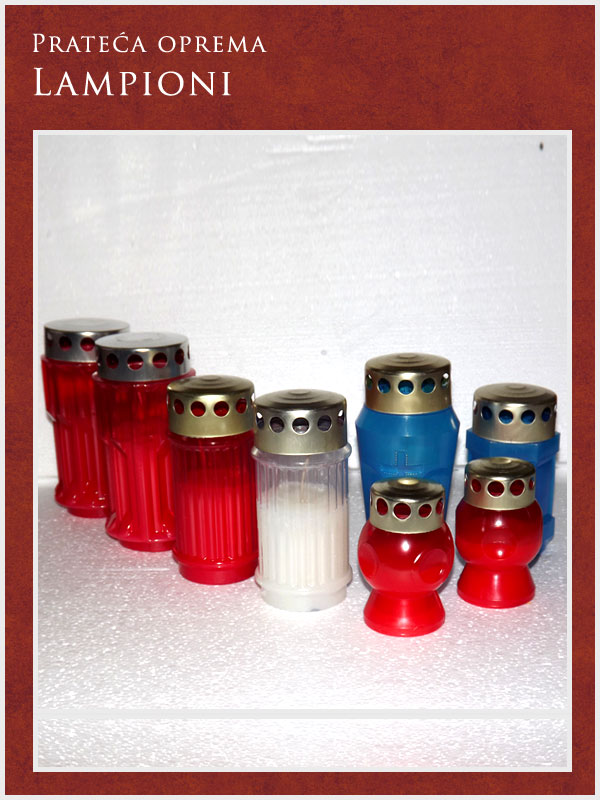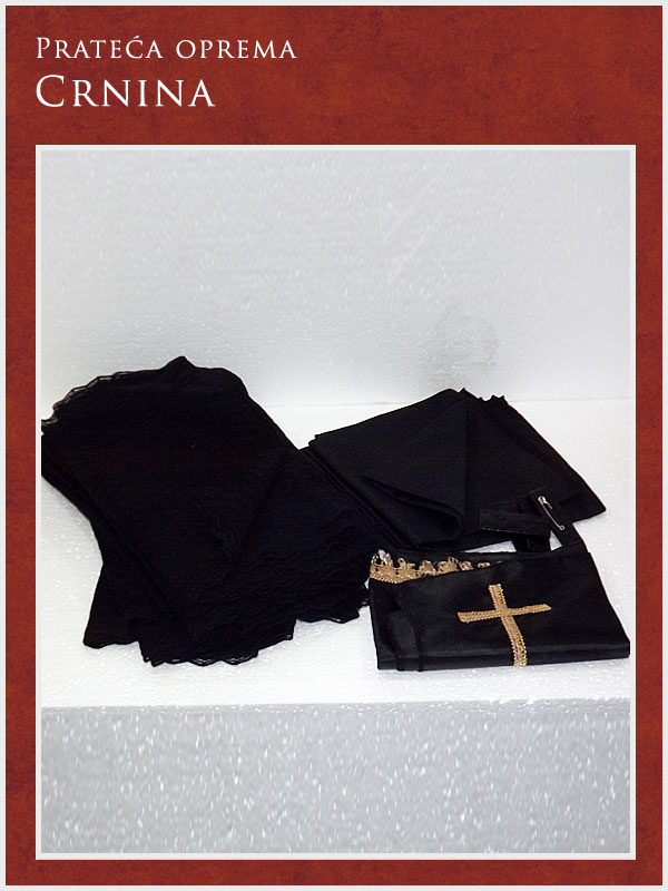 U ponudi imamo kompletnu prateću opremu potrebnu za obavljanje sahrane ali i za običaje pomena. Tu spadaju posteljina i garniture izrađene od satena. Tu je i kompletna crnina (ešarpe, marame, florovi, muške i ženske košulje), peškiri, sveće i svećnjaci, lampioni, kadionice, tamjan, briketi, ramovi za slike ...
