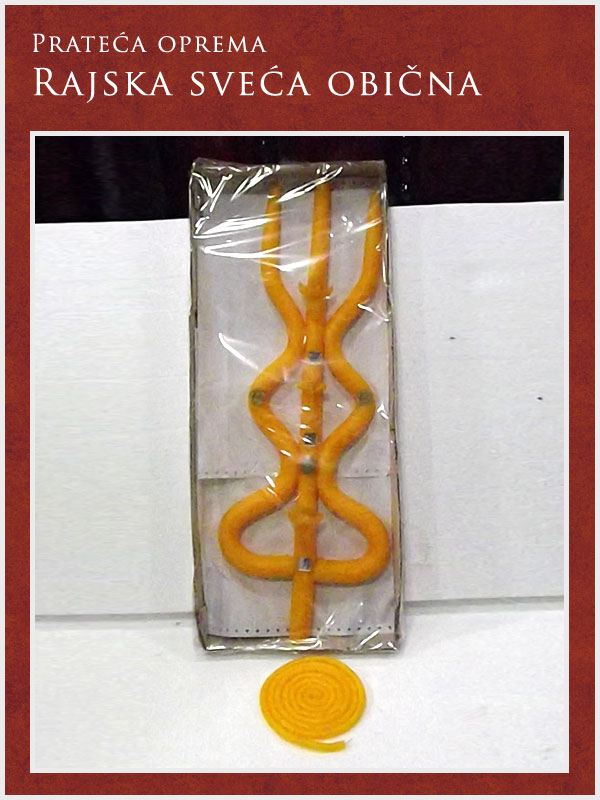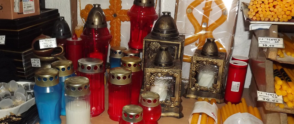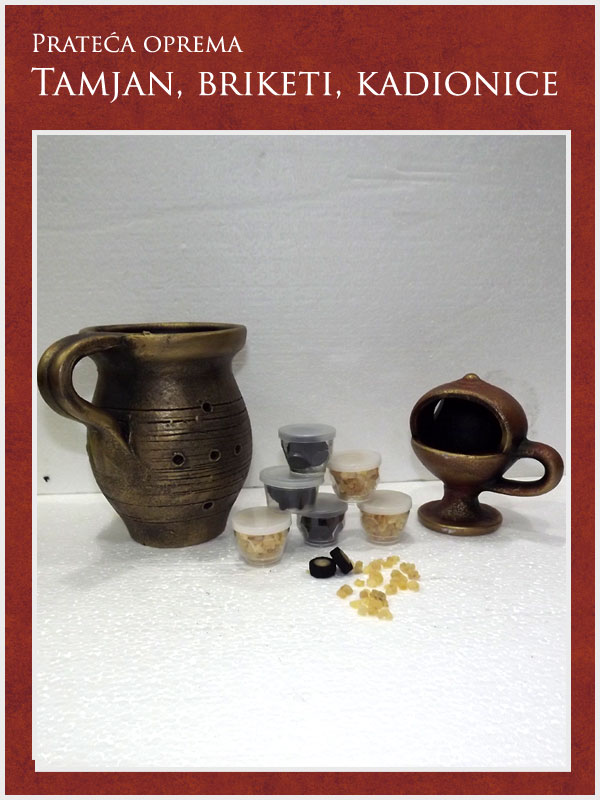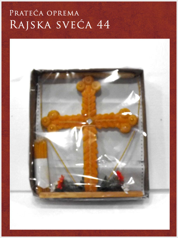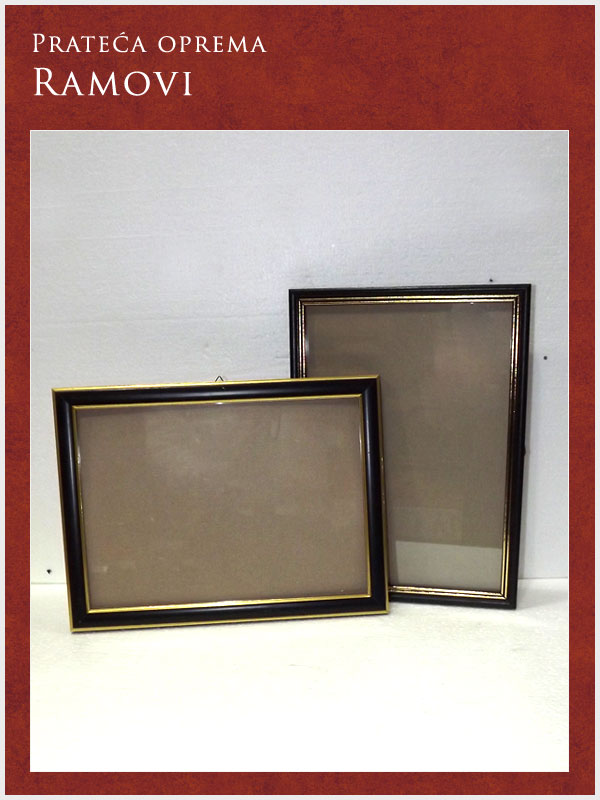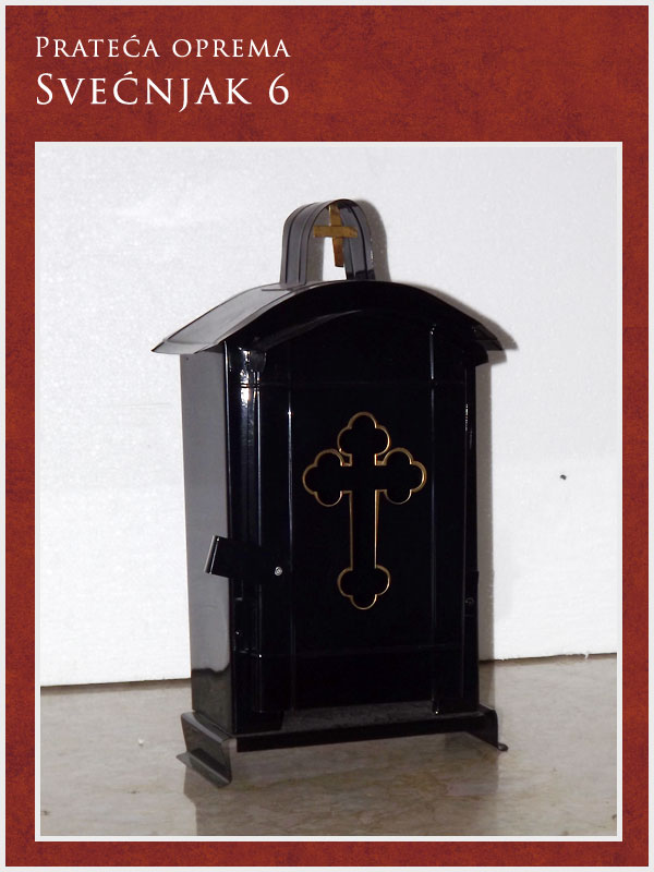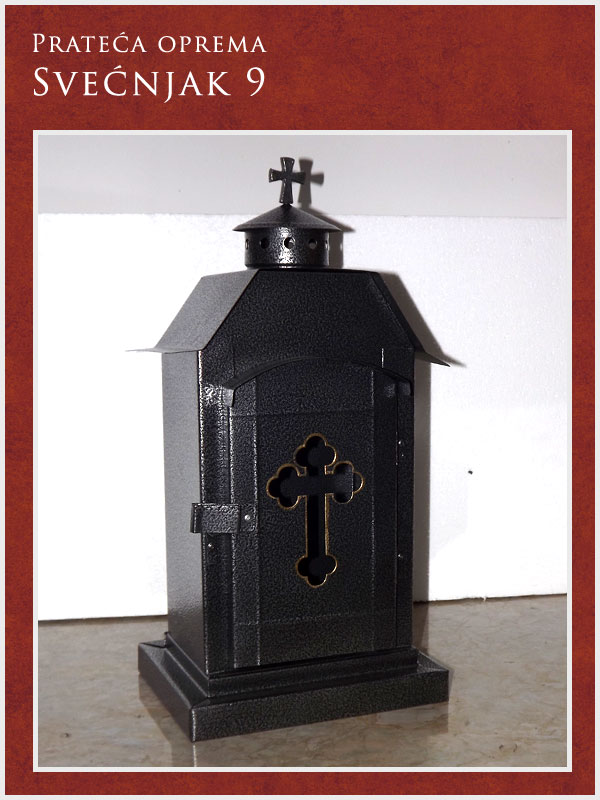 U ponudi imamo kompletnu prateću opremu potrebnu za obavljanje sahrane ali i za običaje pomena. Tu spadaju posteljina i garniture izrađene od satena. Tu je i kompletna crnina (ešarpe, marame, florovi, muške i ženske košulje), peškiri, sveće i svećnjaci, lampioni, kadionice, tamjan, briketi, ramovi za slike ...